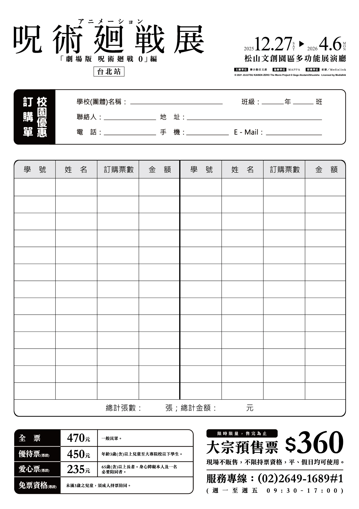 本案聯絡人:活動推廣部校園優惠票服務專線:(02)2649-1689#1(代表號)服務時間:周一至周五09:30-17:00。 |