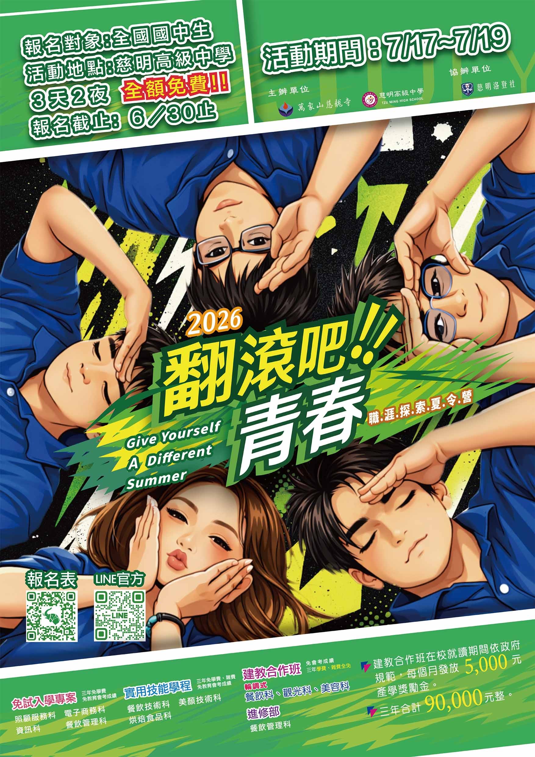 轉知:慈明學校財團法人臺中市慈明高級中等學校115年7月17-19日辦理<翻滾吧!青春>三天兩夜夏令營訊息,鼓勵報名。